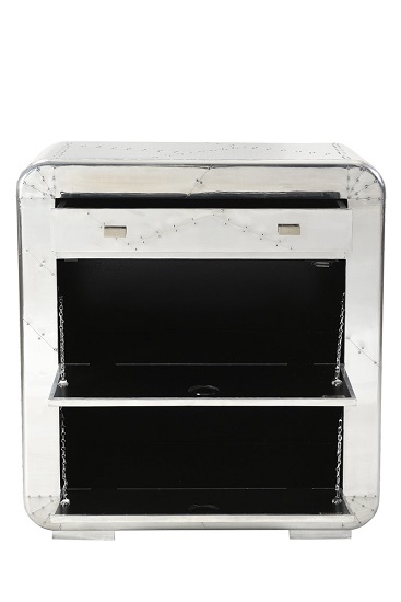 Das Design im Alu-Look ist im wahrsten Sinne des Wortes ein echtes Glanzstück. Der aus Mangoholz und MDF bestehende Korpus ist komplett mit Alu beschlagen. Durch die Spiegelung in den Möbelstücken, wirken Ihre Räume größer und offener.