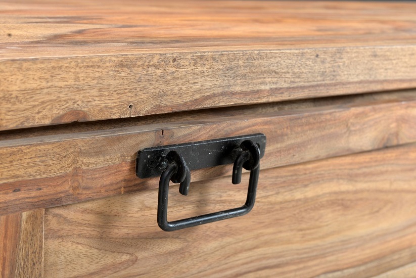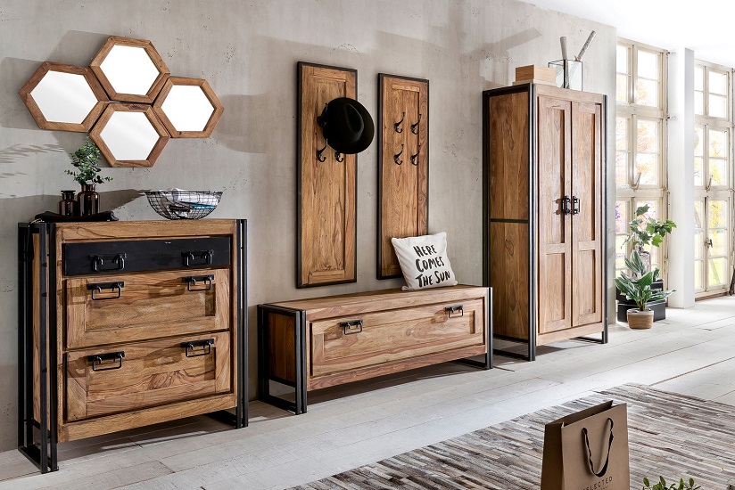 Dieses rustikale Dielen-Set im Factory-Design wurde in aufwändiger Handarbeit "auf alt getrimmt". Durch den warmen Farbton des Akazienholzes im Kontrast zu dem schwarzen Altmetall setzen Sie ein stylisches Statement schon im Eingangsbereich.