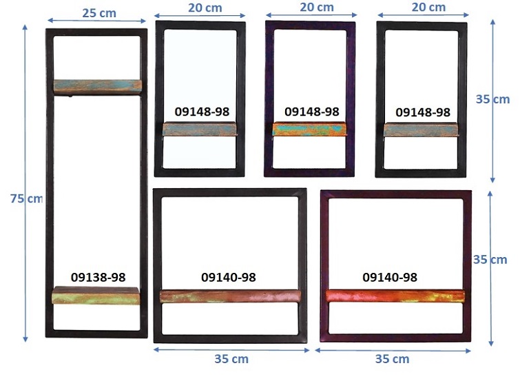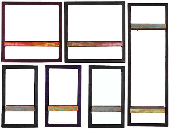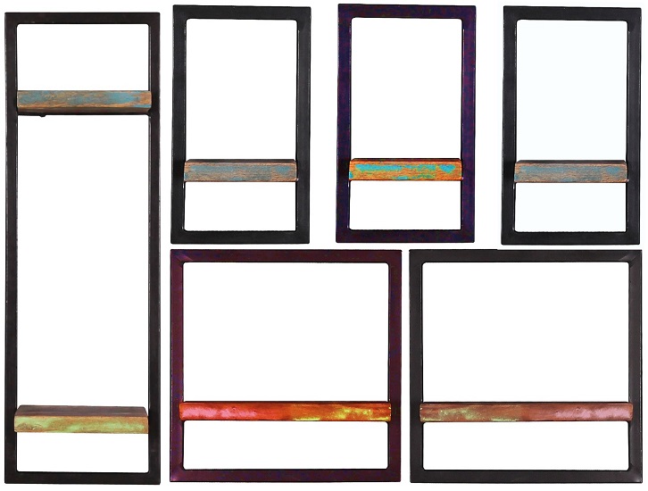 Dieses Set aus 6 Wandregalen mit bunt lackiertem und auf alt getrimmten recyceltem Holz mit einem auf antik getrimmten Metallrahmen können Sie ganz individuell gestaltet aufhängen. Natürlich können Sie die Regale auch einzeln in verschiedenen Räumen verwenden, die Nutzung ist also äußerst vielseitig.