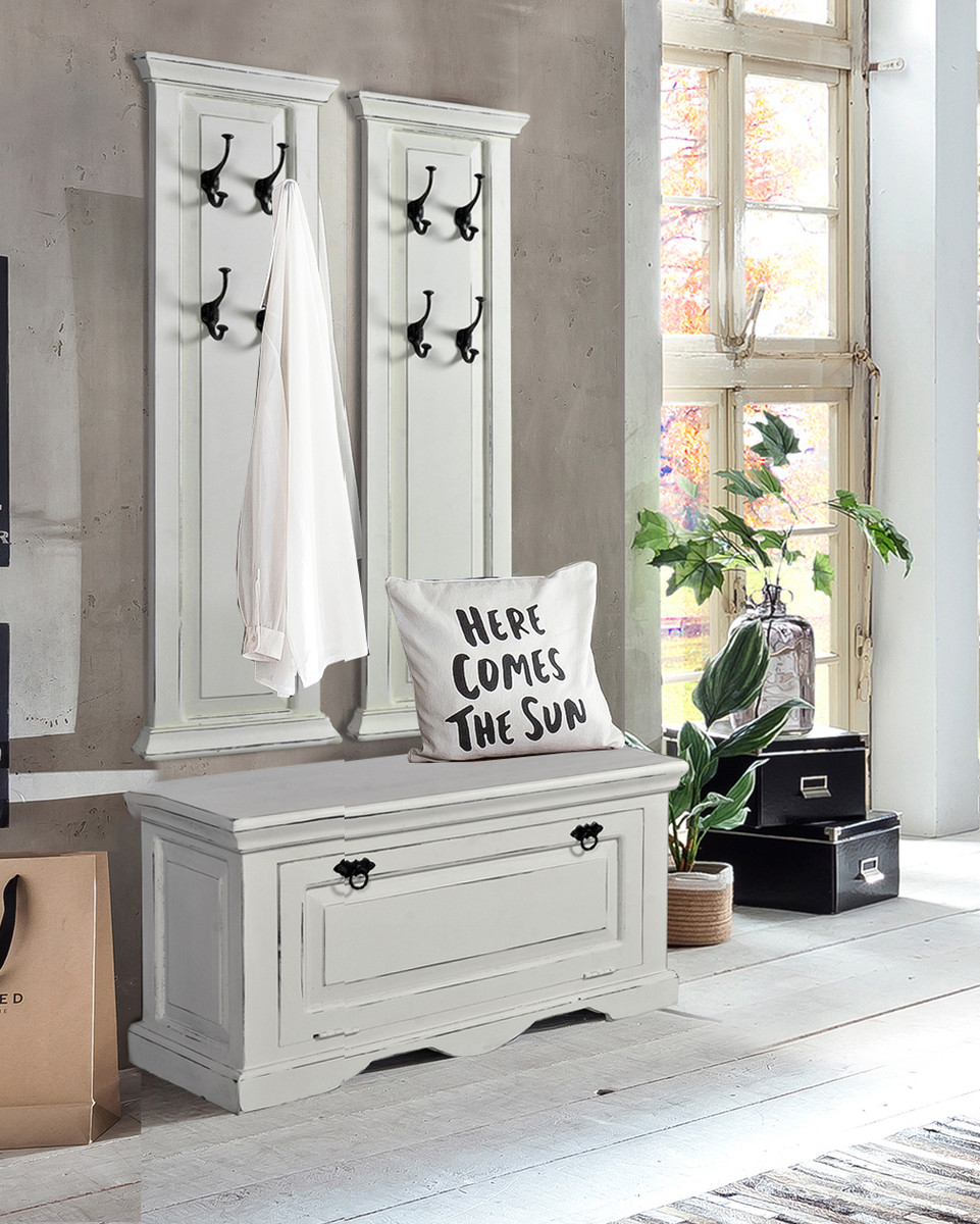 Holen Sie sich mit diesem Dielen-Set Urlaubsfeeling in Ihr Haus. Ein niedriger Schuhschrank bietet Platz für ca. 6 Paar Schuhe und ist auch kurzfristig als Bank einsetzbar, um das Schuhe anziehen zu erleichtern. Die 2 Garderobenpaneele mit je 4 Doppel-Haken bieten zusätzlichen Platz für Jacken, Mäntel oder Taschen. Mit diesem Dielen-Set aus weiß lackierten Mangoholz teilmassiv bringen Sie einen frischen, skandinavischen Stil in den Flur und setzen ein stylisches Statement schon im Eingangsbereich.
