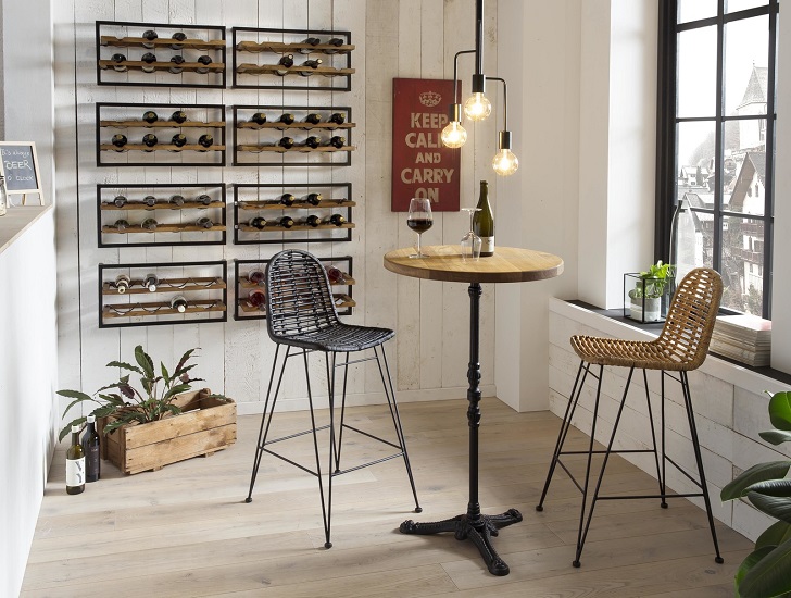 Dieser Stehtisch überzeugt mit seinem Zusammenspiel aus einer naturfarbigen Wildeiche-Tischplatte und dem schwarzem Gusseisengestell. Der Tisch ist ein richtiger Hingucker in Ihren Wohn- und Essbereich und bringt die Atmosphäre eines kleinen Bistros in Paris zu Ihnen nach Hause.
