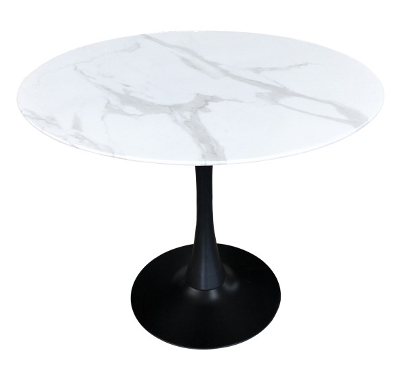 Dieser Tisch überzeugt mit seiner eleganten, mamor Tischplatte. Die runde Tischplatte aus Glas in Marmoroptik bietet einen schönen Kontrast zum schwarzen Säulenfuß aus Metall. Der Esstisch wird zu einem echten Blickfang in Ihren Wohnräumen.