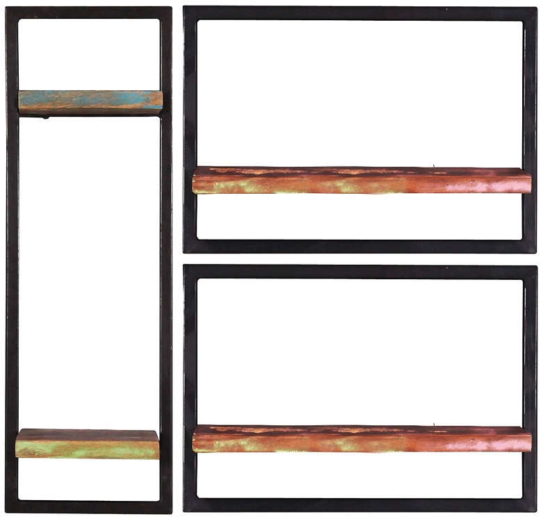 Dieses Set aus 3 Wandregalen mit bunt lackiertem und auf alt getrimmten recyceltem Holz mit einem auf antik getrimmten Metallrahmen können Sie ganz individuell gestaltet aufhängen. Natürlich können Sie die Regale auch einzeln in verschiedenen Räumen verwenden, die Nutzung ist also äußerst vielseitig.